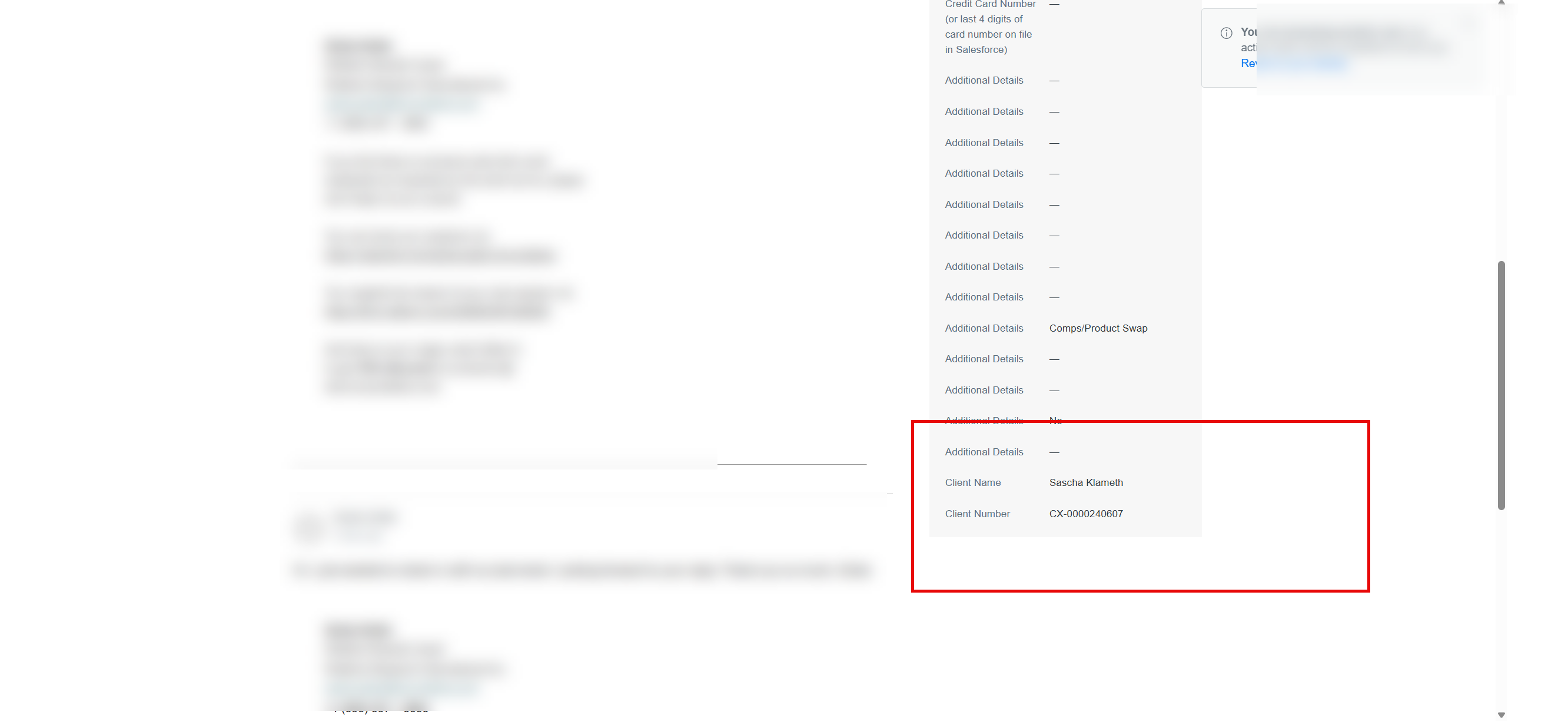 At the bottom of the panel, you’ll find the Client Name and Client Number associated with the request.